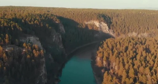 این فوتیج نمای هوایی از رودخانه ای است که از وسط یک جنگل زیبا عبور می کند.
