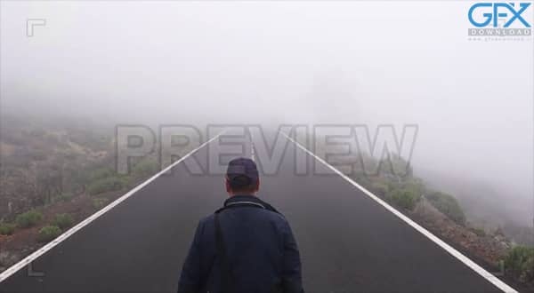 دانلود فوتیج آماده قدم زدن مرد در جاده مه آلود کوهستانی