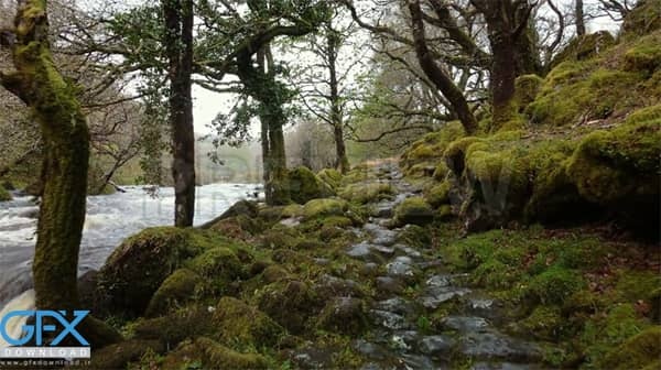 دانلود فوتیج طبیعت مسیر رودخانه صخره ای با درختان زیبا
