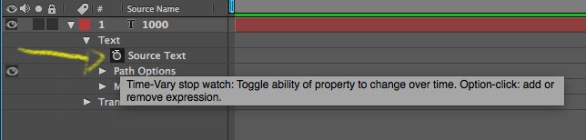 ۲. کلید Alt یا Option را نگه دارید در حالی که روی stopwatch برای ویژگی Source Text لایه متن کلیک می کنید .