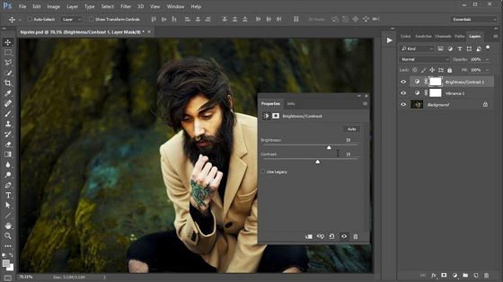 به منوی Layer> New Adjustment Layer> Vibrance بروید. Vibrance را به مقدار 83 و Saturation را 0 تنظیم کنید. سپس یک لایه Adjustment جدید برای کنتراست و روشنایی اضافه کنید. مقدار Brightness را 59 و Contrast را 15 تنظیم کنید.