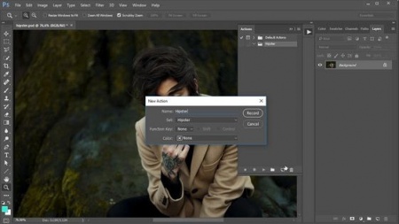 حال اکشن خود را تنظیم کنید. برای دسترسی به پالت Action به Window> Actions بروید. با کلیک بر روی آیکون New Action Set برای ایجاد یک پوشه برای اکشن خود، و سپس New Action را انتخاب کنید و نام آن را "Hipster" انتخاب کنید. هنگامی که آماده حرکت هستید، دکمه Record را فشار دهید تا مراحل بعدی شما ثبت شود.