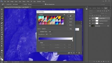لایه نهایی New Adjustment را برای Gradient Map اضافه کنید. یک gradient را انتخاب کنید که از آبی #1e13b4 به سفید تبدیل شود. حالت Blend Mode لایه را برای Pin Light تنظیم کنید و Opacity را به 50٪ کاهش دهید.