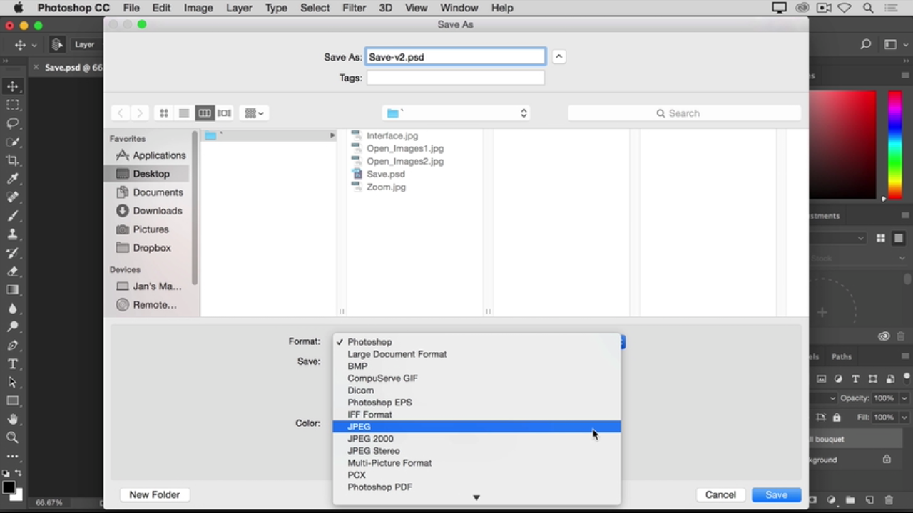 برای این کار از قسمت format ( یا type در windows ) گزینه jpeg را انتخاب کنید . و در انتها بر روی save کلیک کنید .
