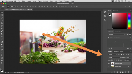اگر move tool را انتخاب کردید ، اما نتوانستید تصویر کوچکتر را جابجا کنید ، احتمالا دلیل آن ، این است که شما لایه ( layer ) مناسب را انتخاب نکرده اید ، در آینده بسیار بیشتر با لایه ها آشنا خواهیم شد ، اما فعلا تنها بدانید که برای ، جا به جایی تصویر کوچک شما می بایست ، در قسمت پنل ها در سمت راست و در قسمت لایه ها ( layers ) حالت small bouquet را انتخاب کرده باشید .