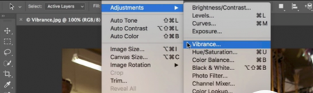 برای باز کردن پنجره vibrance adjustment از منوی بالا ابتدا ، گزینه image و از منوی جدید باز شده adjustment و در نهایت گزینه vibrance را انتخاب کنید .