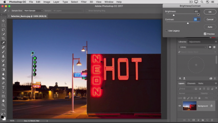 در پنجره brightness / contrast اهرام brightness را به سمت چپ برده و کاهش دهید تا تصویر ( قسمت select شده ) را کم نور تر شود و اهرام contrast را به سمت راست کشیده تا چگالی رنگ را درپروژه خود افزایش دهیم و در نهایت زمانی که تغیرات باب میلتان بود ، بر روی ok کلیک کنید ( کارایی کلید preview را از بخش های قبل به خاطر دارید ؟ )