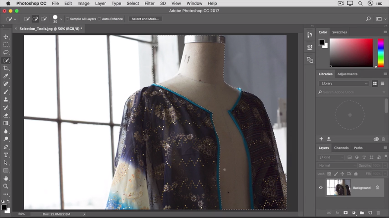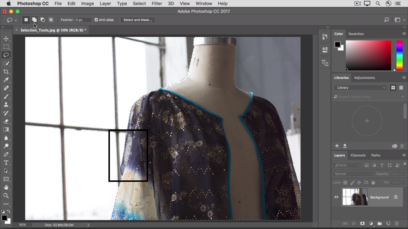 این ابزار سلکشن می تواند اشیا را در پروژه ها به وسیله رنگ لبه ی آن ها شناسایی می کند و در نتیجه بسیاری از کارهای انتخاب را برای شما انجام می دهد ، فرض کنید که در پروژه فوق ما می خواهیم مانکن در تصویر را انتخاب کنیم .