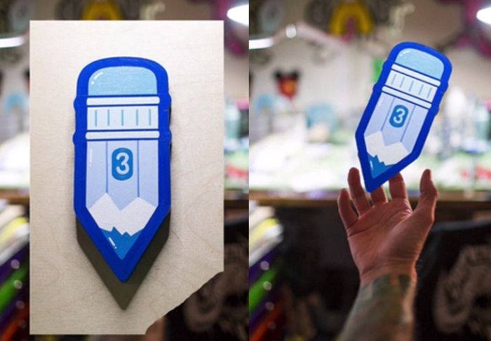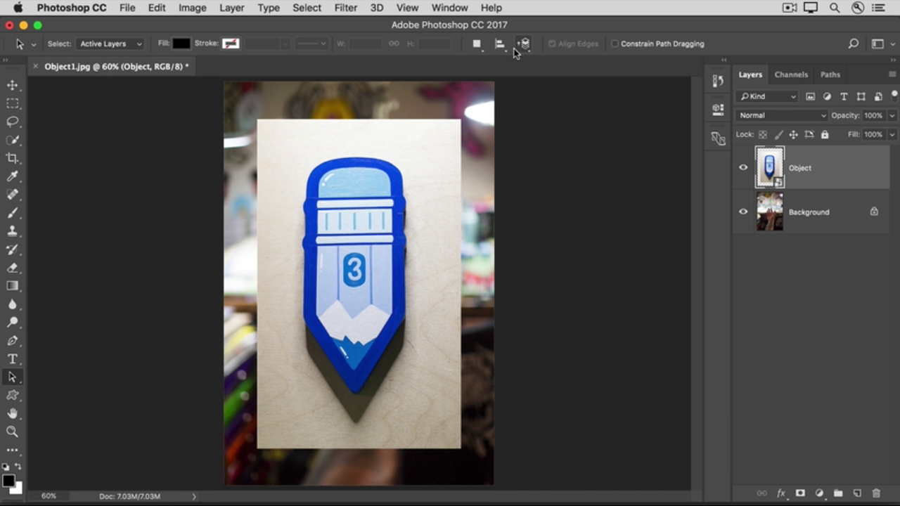 حال بیاید تا این قسمت از آموزش های جامع فتوشاپ را با کوچک تر کردن و جا به جا کردن این مداد تمام کنیم . برای این کار ابتدا از منوی بالا گزینه edit را انتخاب کنید ، سپس از منوی جدید باز شد گزینه free transform را انتخاب می کنیم ، حال با نگه داشته کلید shift سعی می کنیم تا این مداد را کوچک تر کرده و در نهایت کمی آن را می چرخانیم تا به حالت زیر برسیم .