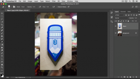 در این جا و همان طور که مشاهده می کنید ، تصویر دومی که ما باز کرده ایم ، تصویر یک مداد بر روی یک پس زمینه چوبی است ، حال ما می خواهیم تا این پس زمینه چوبی را از پروژه حذف کنیم ، یکی از ساده ترین ، ابتدایی ترین و پیش پا افتاده ترین ابزار ،پاک کن یا eraser tool می باشد ، برای استفاده از این ابزار می بایست ، از منوی ابزار ها در سمت چپ، ابزار پاک کن یا eraser tool را انتخاب کنید ، ( یازدهمین ابزار از سمت بالا ) سپس به سمت تصویر رفته و شروع به پاک کردن قسمت های اضافی کنید ( توجه داشته باشید که در ابتدا با یک پیغام از سمت sharp objects مواجه خواهید شد ، که البته اهمیتی ندارد و تنها نیاز است تا شما بر روی ok کلیک کنید ) سپس شروع کنید به حذف کردن قسمت های اضافی از پروژه که به آنها نیازی ندارید . ( فقط کافی است تا نشانگر موس را بر روی آنها برده کلیک کرده و بکشید تا تمام سطحی که می خواهید حذف کنید را تحت پوشش قرار دهید )