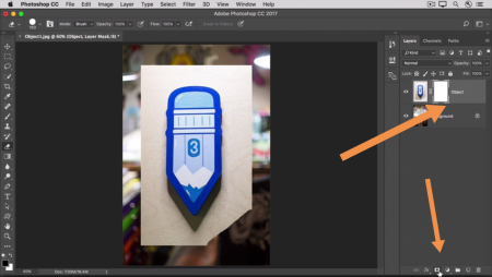 برای ایجاد یک لایه ماسک ( یا mask layer ) ابتدا باید از سمت راست و قسمت پنل لایه ها لایه ای که می خواهید لایه ماسک بر روی آن قرار گیرد را انتخاب کرده باشید ، به عنوان مثال ما در این جا لایه object را انتخاب می کنیم ، پس از آن شما می بایست تا از قسمت پنل ها و در سمت راست بر روی قسمت پایینی آن یعنی ، قسمت پایین پنل ها ، بر روی آیکونی که به شکل یک مستطیل است و درون آن یک دایره است ، کلیک کنید ( برای درک بهتر این که بدانید به روی چه گزینه ای کلیک کنید ، به تصویر زیر نگاه کنید ، منظور آیکون مشخص شده در تصویر زیر است )