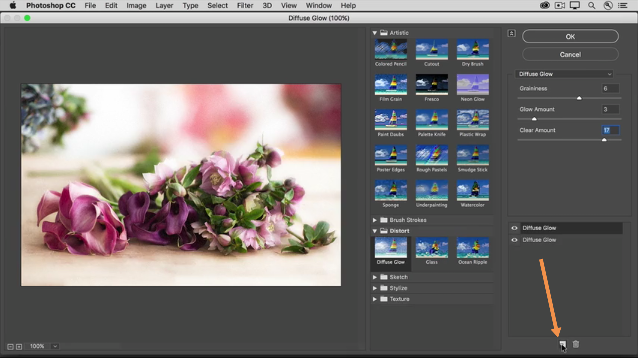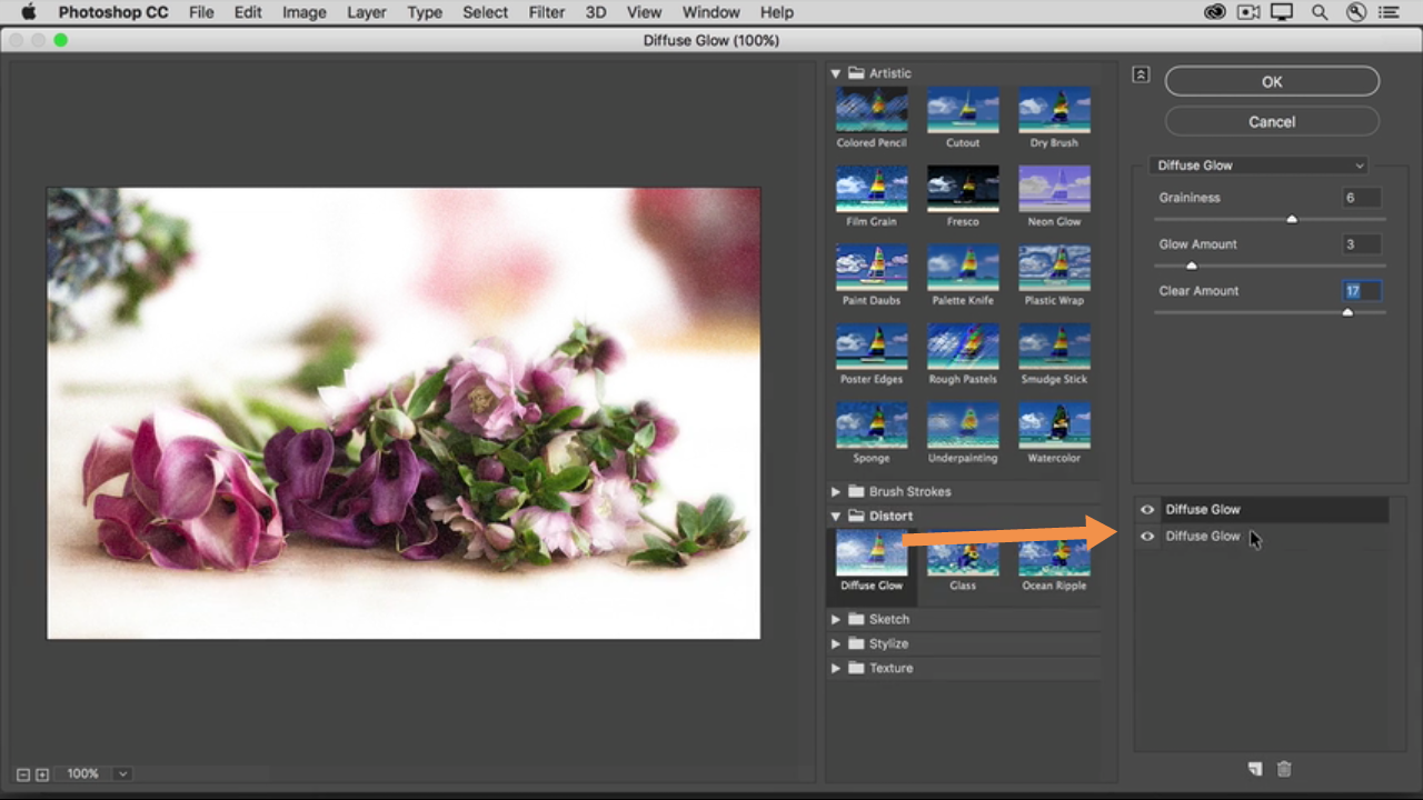 بله همانطور که متوجه شدید ، این قسمت شباهت بسیار زیادی به پنل لایه ها دارد ، لذا از این پس آن را پنل فیلتر ها می نامیم ، در این قسمت تمامی فیلتر های باز شده برای شما نمایان خواهد شد ، فعلا و تا به این جا ما تنها یک فیلتر ( فیلتر diffuse glow ) را باز کرده ایم ، بنا بر این و همان طور که ماهده می کنید تنها یک فیلتر ( فیلتر diffuse glow ) در پنل لایه ها موجود است .
