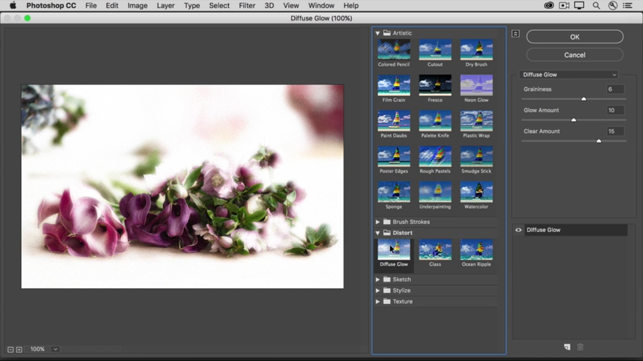 به عنوان مثال ما در این جا فیلتر diffuse glass را از بین این سه فیلتر انتخاب می کنیم . در تصویر زیر می توانید ویژگی ها و تغیراتی که به وسیله این فیلتر به پروژه ما اضافه می شوند را به طور کامل مشاهده کنید .