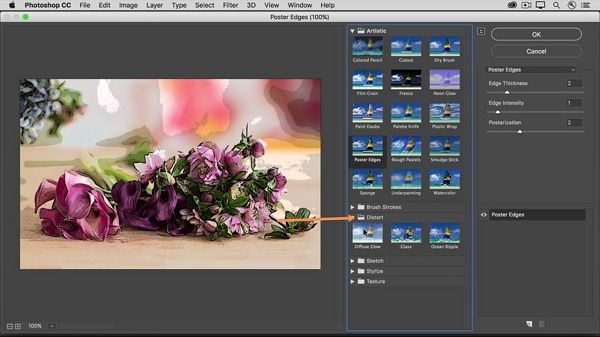 البته تعداد فیلتر های موجود در فتوشاپ بسیار بیشتر از آنجه که شما در این جا می بینید ، می باشد . برای استفاده از فیلتر های بیشتر ، شما می توانید تا بر روی پوش های موجود در این قسمت کلیک کنید ، این اقدام باعث خواهد شد تا فیلتر ها و محتوای موجود در این پوشه ها برای شما نمایان شود . به عنوان مثال به تصویر زیر دقت کنید ، همانطور که می بیند ، ما بر روی پوشه Distort کلیک کرده ایم و محتوای آن که شامل سه فیلتر می باشد ( فیلتر های diffuse glow – glass – ocean ripple ) برای ما نمایان شده است و ما نیز می توانیم از میان آنها انتخاب کنیم و بر روی پروژه خود اعمال کنیم .