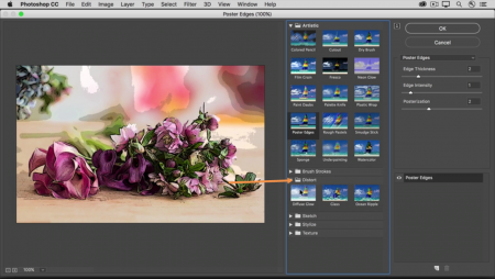 البته باید در نظر داشته باشید که ، باز کردن فیلتر ها به روش بالا ، باعث می شود تا فیلتر ها به صورت تکی باز شوند ، اما معمولا پیش می آید که ما تمایل داریم ، تا چندین فیلتر را به صورت هم زمان بر روی پروژه خود اعمال کنیم ، برای اعمال هم زمان و چند گانه فیلتر ها ، ابتدا از منوی بالا گزینه filter را انتخاب کنید ، سپس از منوی جدید باز شده گزینه filter gallery را انتخاب کنید ، این اقدام باعث خواهد شد تا محیط کاربری ، فیلتر ها برای شما باز شود ، این محیط به شکل زیر می باشد .