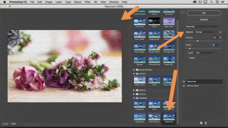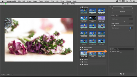 همانطور که مشاهده می کنید ، فیلتر جدید نیز با نام همان فیلتر قبلی نام ( diffuse glow ) نام گذاری شده است ، برای تغیر این فیلتر بر روی یکی از آن ها کلیک کرده ، سپس از قسمت فیلتر ها یک فیلتر جدید انتخاب کنید ، شاهد خواهید بود که فیلتر جدید جایگزین فیتر قبلی خواهد شد ، به عنوان مثال ما در این جا فیلتر بالایی را انتخاب می کنیم ، حال به سمت فیلتر ها رفته و از میان آنها فیلتر جدیدی را انتخاب می کنیم ، خوب در اینجا ما پوشه texture را انتخاب می کنیم ، این کار باعث می شود تا پوشه مورد نظر باز شود و محتوای درون آن برای ما نمایش داده شود . حال از پوشه texture یکی از فیلتر ها را انتخاب می کنیم ، به عنوان مثال فیلتر texturizer را انتخاب می کنیم .