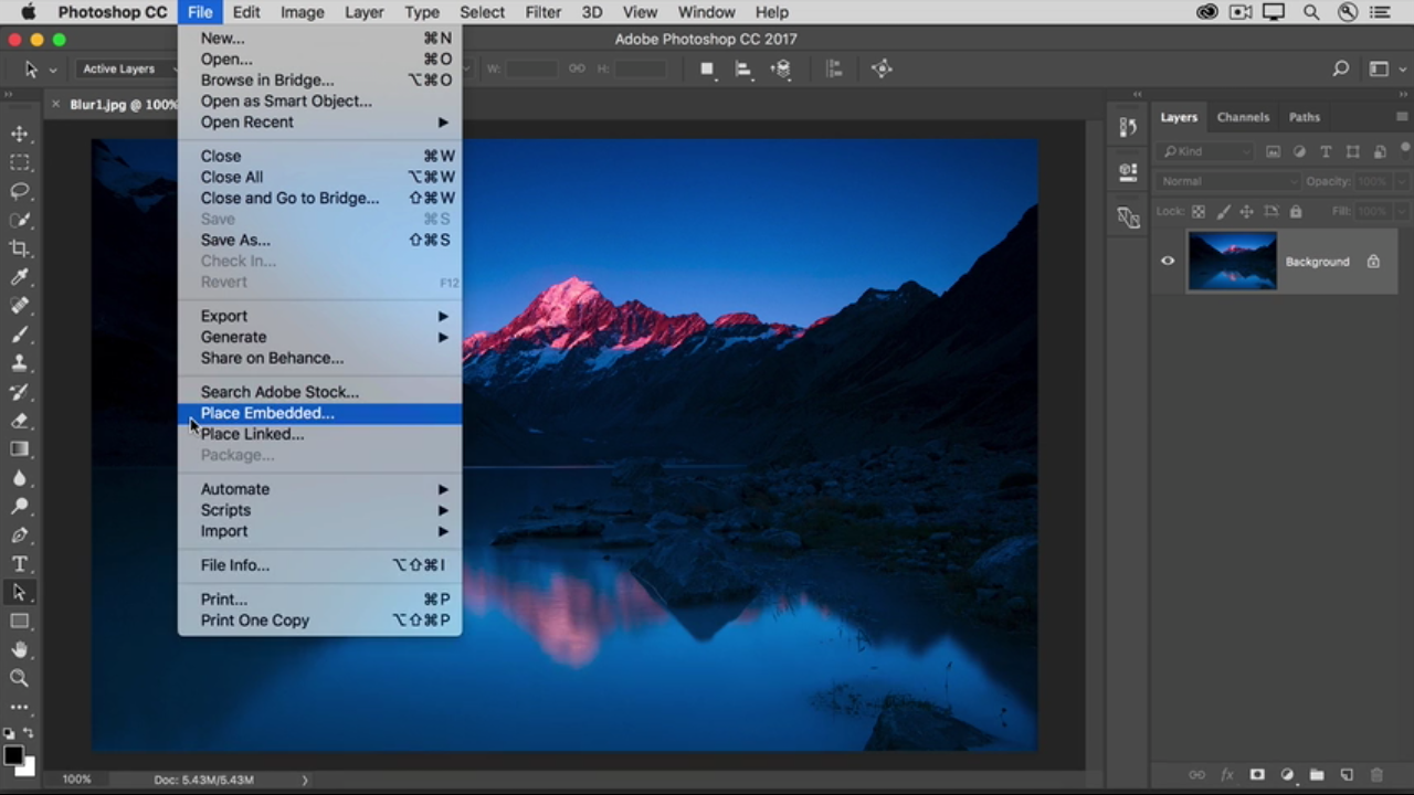 ابتدا از منوی بالا گزینه file را انتخاب کنید ، سپس از منوی باز شده جدید ، گزینه place embedded را انتخاب کنید