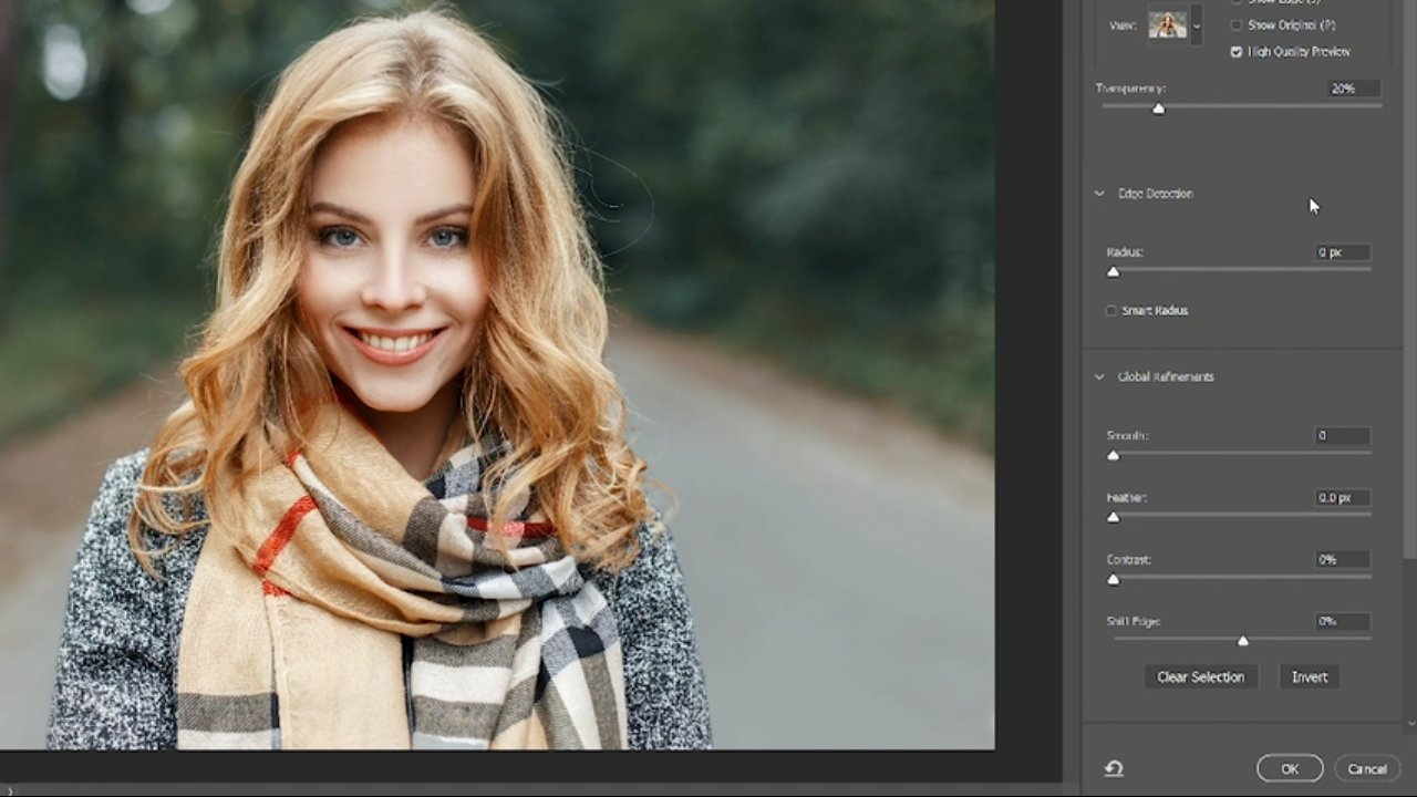 انتخاب کردن گزینه select and mask باعث می شود تا منوی تنظیمات زیر باز شود .