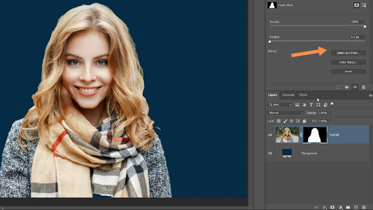 ابتدا لایه ماسک را انتخاب کنید ، سپس از طریق منوی properties panel گزینه ی select and mask را انتخاب کنید .