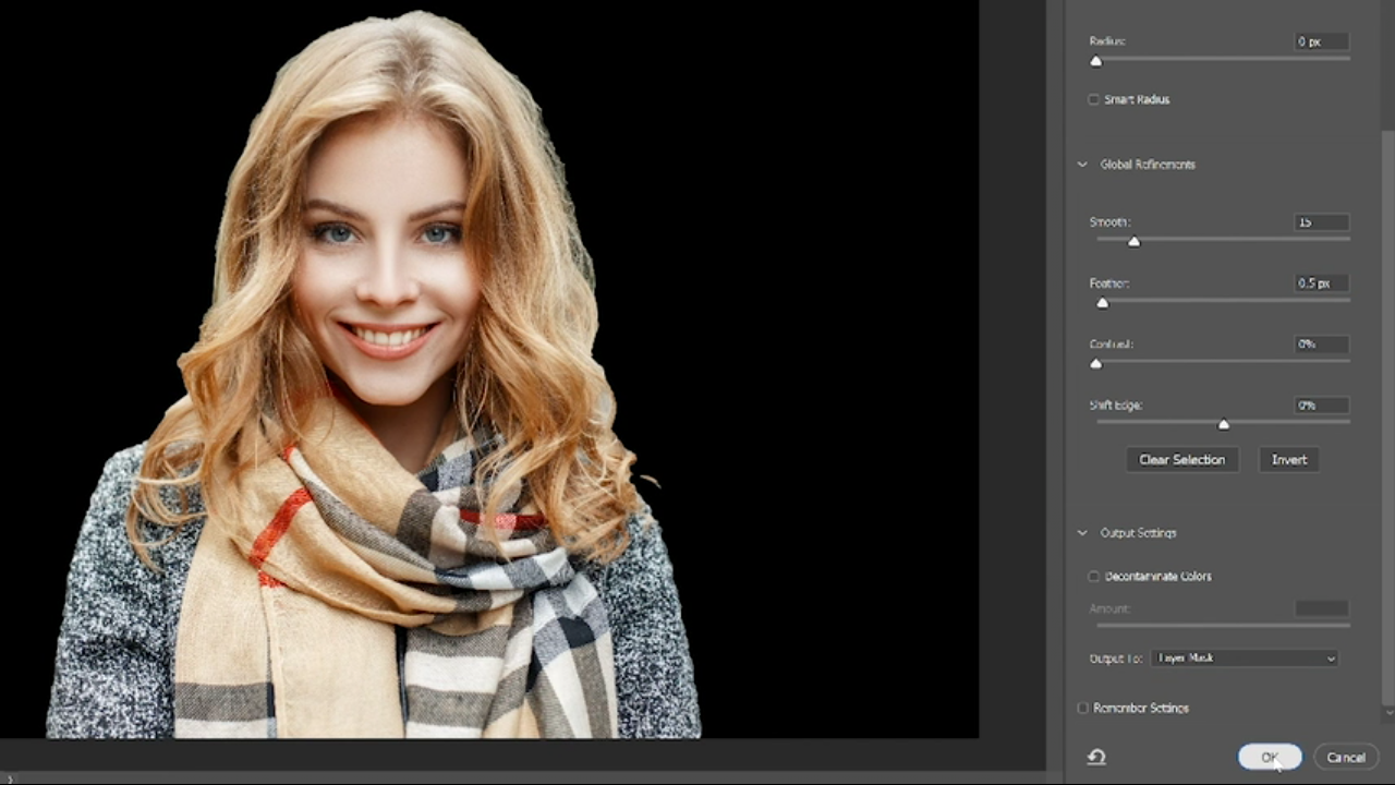 نکته بسیار مهمی که باید حمتا در نظر داشته باشید ، این است که در قسمت out put setting ، از منوی out put گزینه ی layer mask را انتخاب کنید و در انتها بر روی ok کلیک کنید . ( اگر منوی out put را مشاهده نمی کنید ، اهرام scroll را به سمت پایین بکشید . )