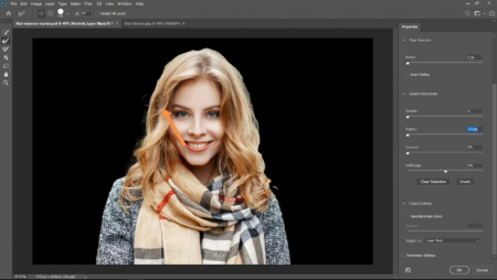پس از آن دوباره به سراغ منوی properties رفته و گزینه select and mask را انتخاب کنید ، در ادامه از قسمت ابزار ها در سمت چپ ابزار healing brush tool را انتخاب کنید ، کمی اندازه قلمو را بزرگ تر کنید ، سپس به سمت تصویر رفته و سعی کنید تا قلمو را در اطراف و کناره های موی شخص در تصویر بکشید ، این اقدام باعث می شود تا اگر قسمتی از مو ها به اشتباه پاک شده باشند ، به تصویر باز گردانده شوند ، البته این حذفیات در حد بسیار کوچکی می باشد ، که حتی می توان گفت تقریبا به چشم نمی آید ، اما باید یاد آور شویم که زمانی که یک پروژه را به صورت حرفه ای پیش می برید ، یکی از مهم ترین نکات این است که هیچ جزئیاتی را از دست ندهید .