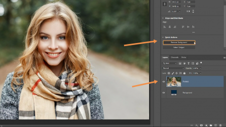 برای این کار کافی است تا تنها روند زیر را دنبال کنیم .ابتئا لایه مورد نظر را انتخاب کنید ، سپس در قسمت پنل ها و در سمت راست به سراغ منوی properties panel رفته و سپس از قسمت quick actions گزینه ی remove background ( به معنی حذف کردن پس زمینه ) را انتخاب کنید .