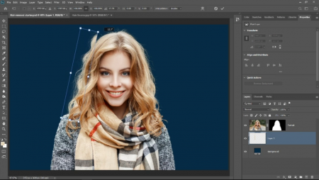 به عنوان مثال ما تصویر زیر را انتخاب کرده ایم . ( شما می توانید هر تصویر دلخواهی را انتخاب کنید . ) در کنار آن و همانطور که در پنل لایه ها نیز مشاهده می کنید ، یک لایه را که لایه پس زمینه است را نیز باز کرده ایم ، این لایه به رنگ آبی است . ( دلیل استفاده از پس زمینه آبی رنگ این است که ، در ادامه ما قصد داریم تا پس زمینه اصلی تصویر را حذف کنیم تا بهتر بتوانیم مو ها را مشاهده کنیم و در هنگام اعمال تغیرات تسلط بیشتری بر پروژه خود داشته باشیم.)