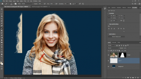 همان طور که در تصویر زیر هم قابل مشاهده است ، فتوشاپ به صورت کاملا هوشمند قسمت های اصلی تصویر را از پس زمینه تصویر متمایز کرده ، پس زمینه را حذف کرده و در انتها یک لایه ماسک ایجاد کرده است . ( نحوه کار کرد لایه ماسک را در آموزش های پیشین به شکل کامل توضیح داده ایم . ) ایجاد یک لایه ماسک توسط فتوشاپ باعث می شود تا پروژه شما تبدیل به یک پروژه لایه محور شود و همیشه قابل ویرایش باشد .