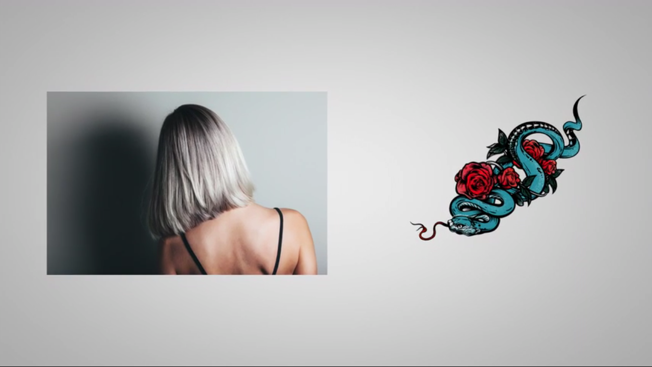 حال در اینجا و پروژه ما دو تصویر وجود دارد یکی تصویر دخترک که تصویر اصلی و پس زمینه پروژه ما نیز محسوب می شود ، دیگری تصویر رز پیچیده شده بر دور یک مار که تصویر فرعی ماست که تمایل داریم تا به عنوان تتو بر روی پشت ( کمر ) مدل خود قرار دهیم . ( توجه داشته باشید که شما می بایست تا تصویری را که می خواهید به عنوان تصویر تتو انتخاب کنید را از قبل برش زده ( CRUP ) باشید و این تصویر نباید شامل هیچ قسمت اضافه ای باشد . )